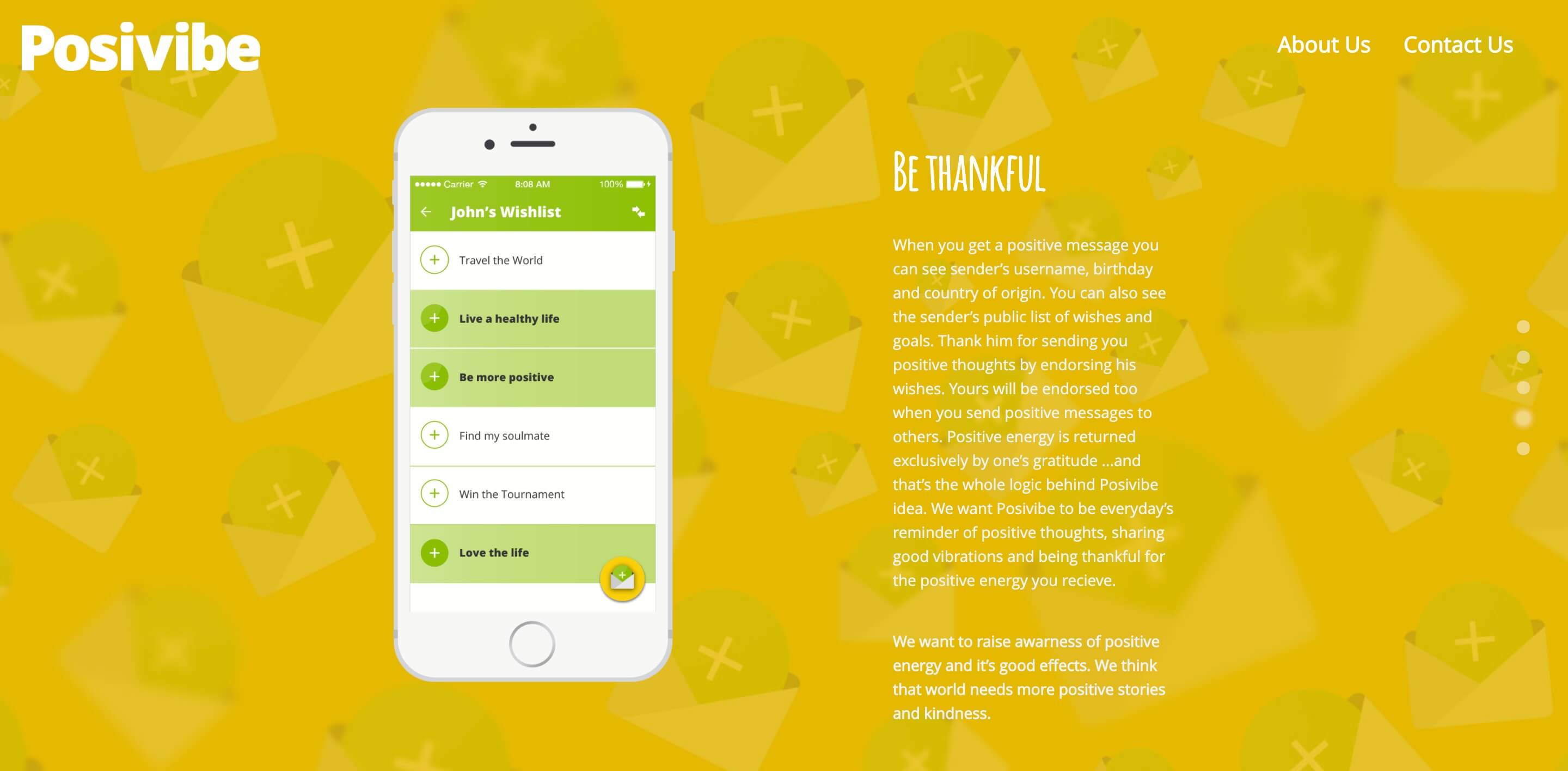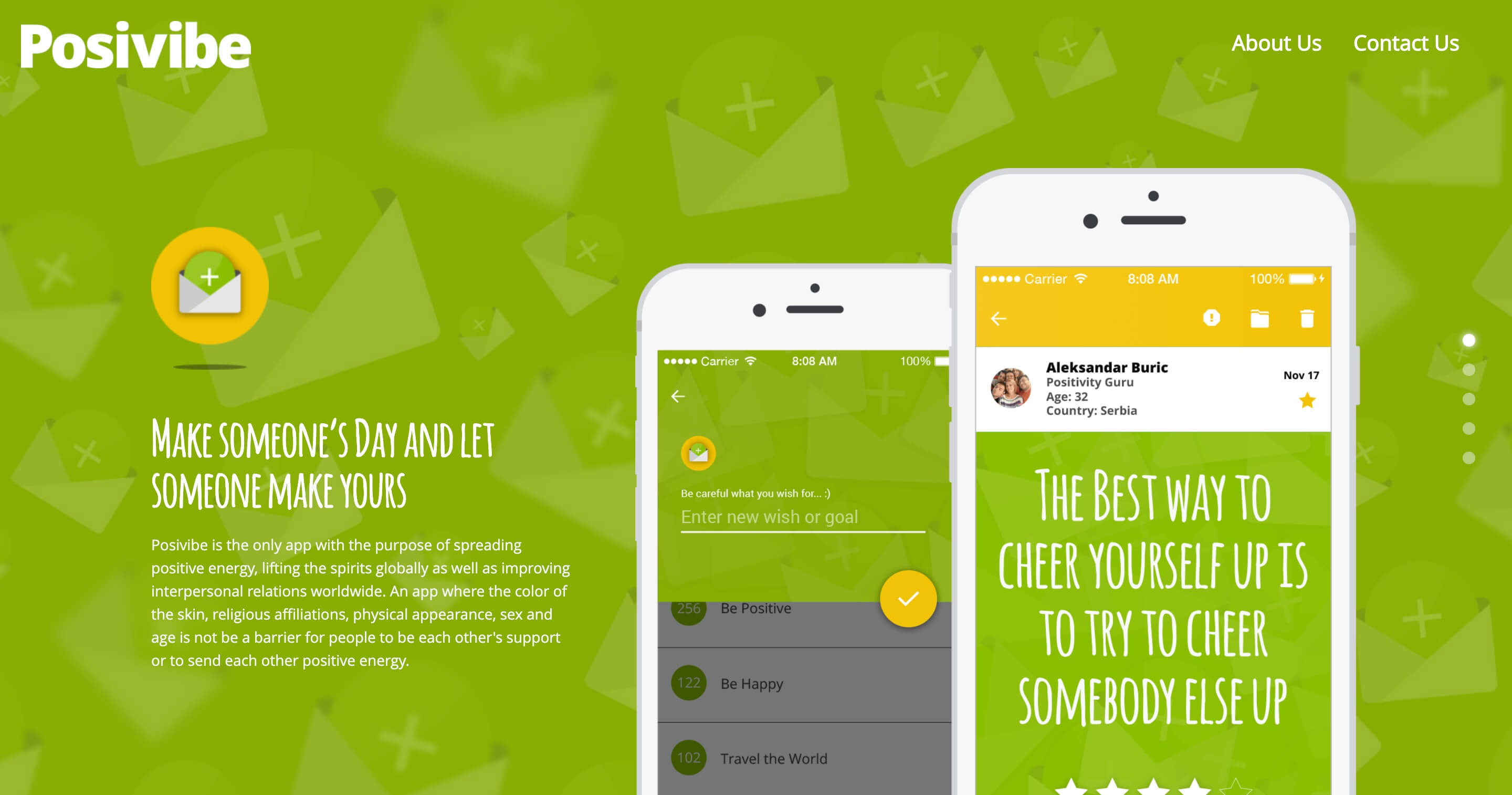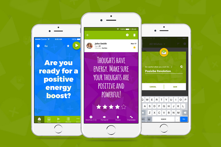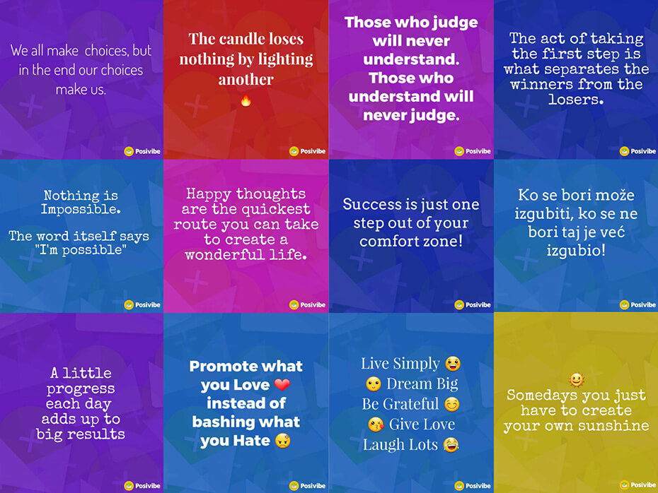 Posivibe is the only app with the purpose of spreading positive energy worldwide, an app where the color of the skin, religious affiliations, physical appearance, sex, and age is not a barrier for people to be each other's support and to send each other positive energy.